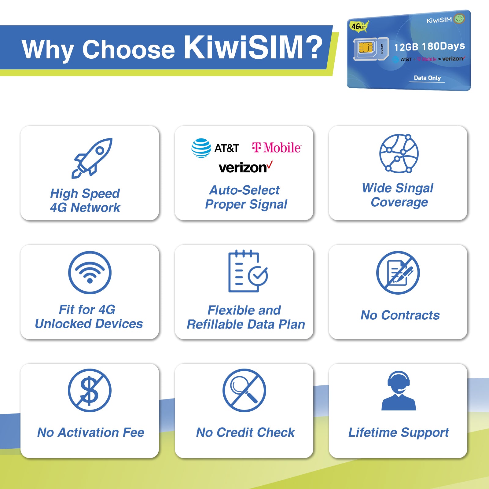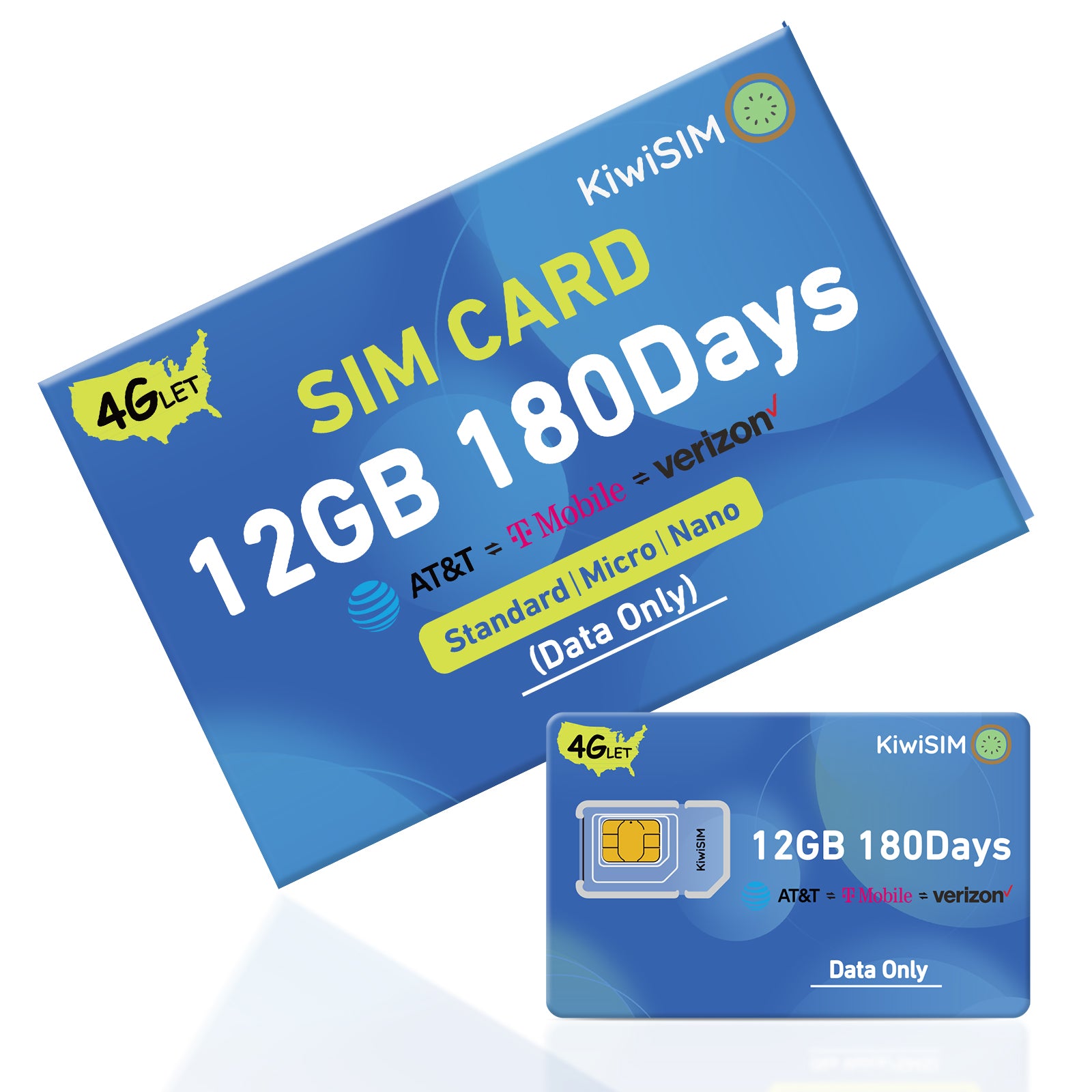 KiwiSIM USA 4G LTE SIM Card-12GB 180 Days-Support for AT&T, T-Mobile and Verizon Network