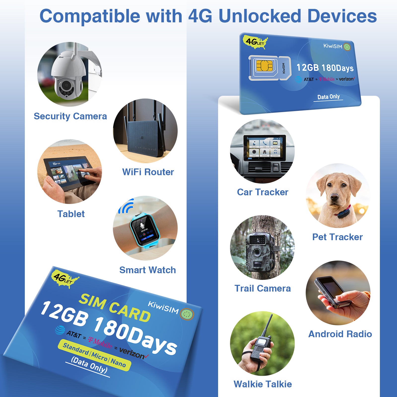 - Fit Unlocked 4G loT Devices: Our SIM card can be used for a lot of 4G devices, such as solar security camera, WiFi router, mobile hotspot, pocket WiFi, hunting camera, walkie talkie, 4G bird feeder and GPS pet/car tracker, etc.