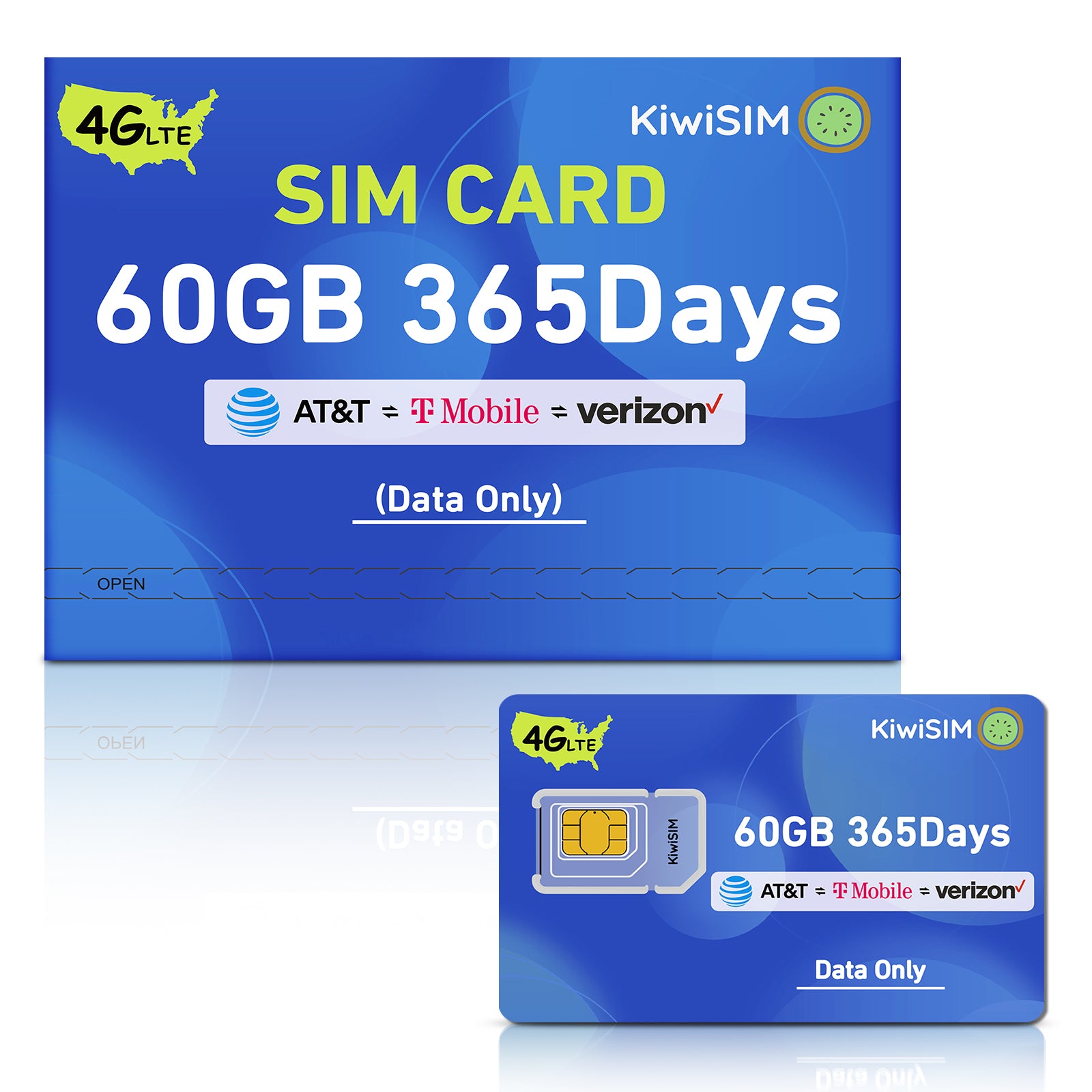 KiwiSIM USA 4G LTE SIM Card-60GB 365Days-Support for AT&T, T-Mobile and Verizon Network