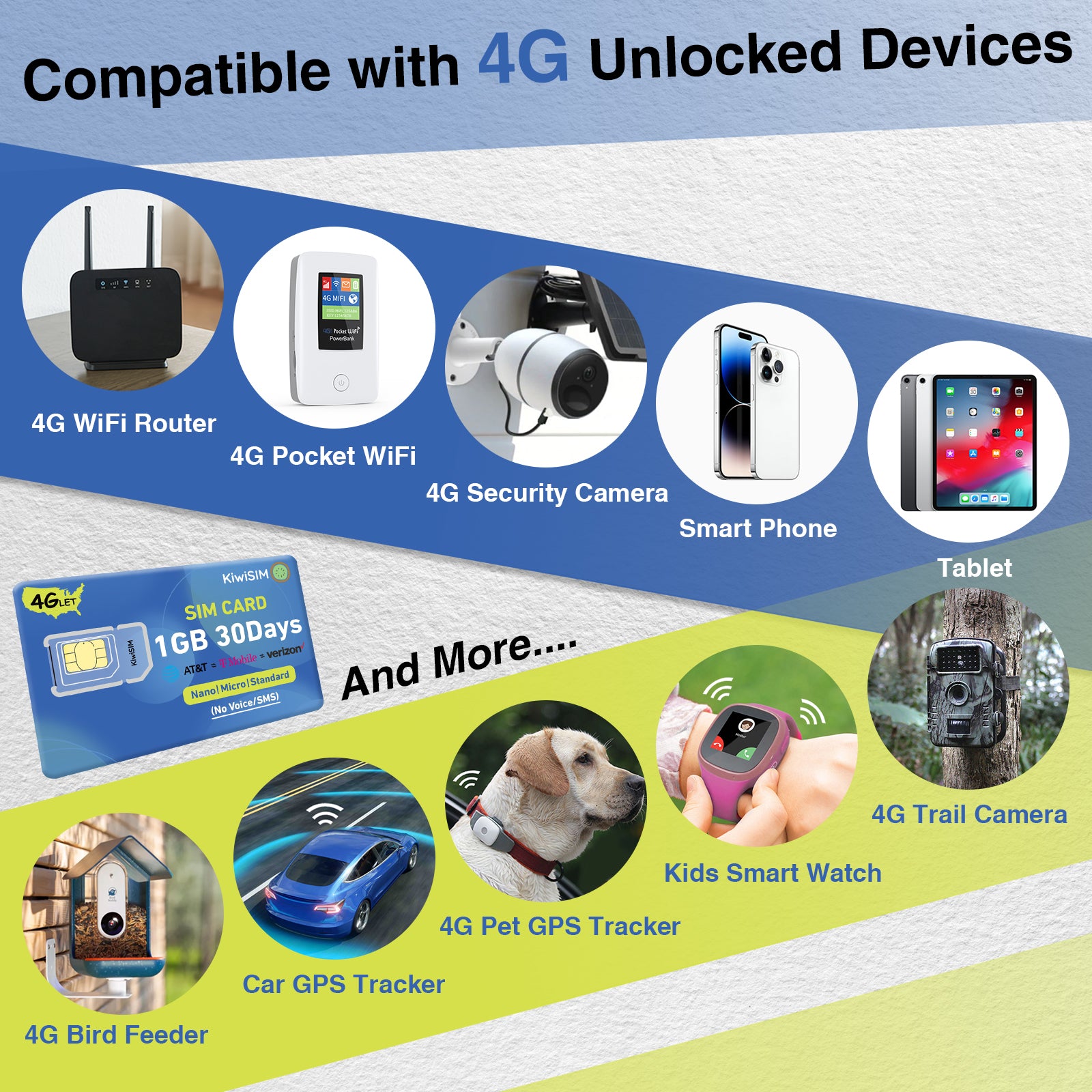 - Fit Unlocked 4G loT Devices: Our SIM card can be used for a lot of 4G devices, such as solar security camera, WiFi router, mobile hotspot, pocket WiFi, hunting camera, walkie talkie, 4G bird feeder and GPS pet/car tracker, etc.